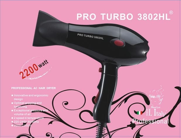 Επαγγελματικός στεγνωτήρας μαλλιών Hair Lux Italy Pro Turbo 3802, με εργονομικό σχεδιασμό, με 3 μέτρα καλώδιο , 2200 WATT με 2 ταχύτητες και 4 θερμοκρασίες , επαγγελματικό μοτέρ μεγάλης διάρκειας AC MOTOR , πολύ δυνατή πίεση και ένταση αέρα για γρήγορο στέγνωμα μαλλιών , με αποσπώμενο φίλτρο αέρα για εύκολο καθαρισμό.Στη συσκευασία συμπεριλαμβάνονται 2 ακροφύσια ( στόμια ) .Διαθέσιμο σε μαύρο χρώμα.