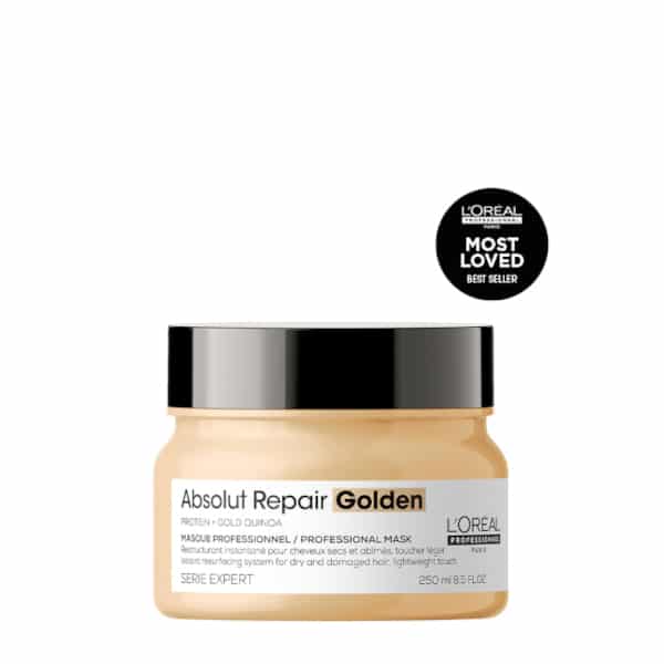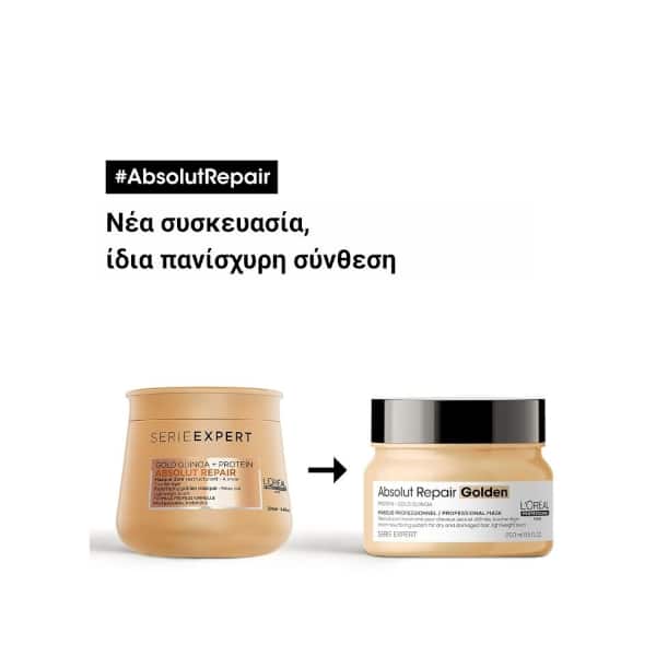 Εμπλουτισμένη με GOLD QUINOA + ΠΡΩΤΕΪΝΗ, η επαγγελματική, ανατρεπτική χρυσαφένια σύνθεση της Resurfacing Golden Masque επανορθώνει αμέσως κάθε τύπο μαλλιών εξασφαλίζοντας ανάλαφρο άγγιγμα.