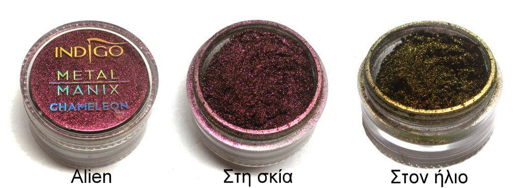 Metal Manix® Chameleon Alien – είναι μια εντυπωσιακή λαμπερή σκόνη που μεταλλάσσει τα χρώματα από πορφυρό σε πράσινο και μπορντό.